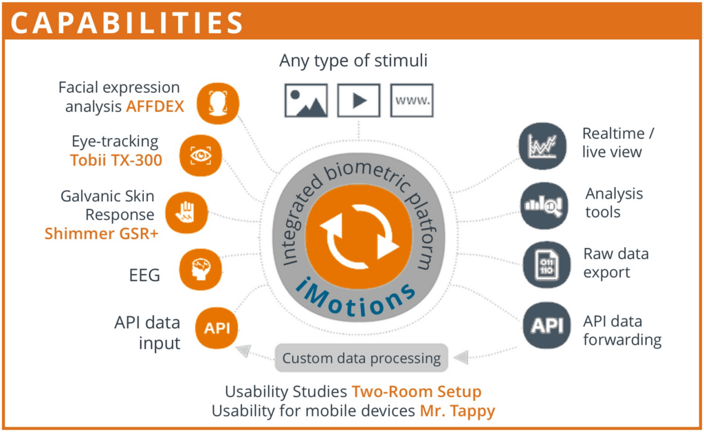 Our lab supports usability testing, eye-tracking research, and biometric data collection using the following equipment and software.